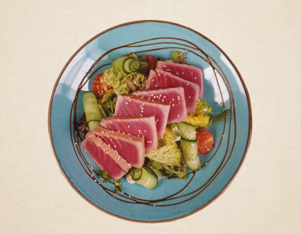 Lapu salāti ar garnelēm un iemārinētiem baltvīnā ķirštomātiem